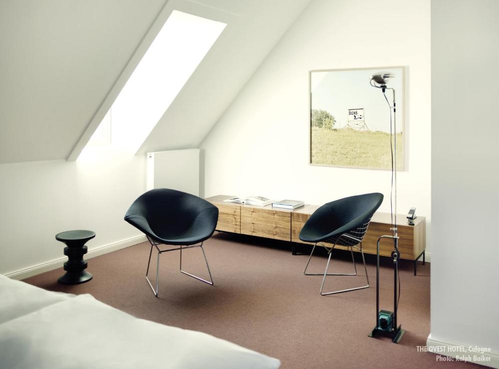 Im THE QVEST hideaway cologne wohnen Sie in geräumigen Zimmern mit Möbeln aus der Mitte des Jahrhunderts und alten Editionen des QVEST-Magazins. Jedes Zimmer ist mit einer Minibar und einem modernen Bad mit Bademänteln ausgestattet.