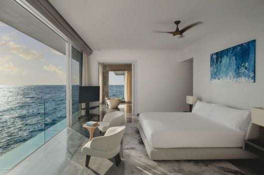 Die Villen des Conrad Rangali Island liegen bis zu 500 m weit im Indischen Ozean und bieten viel Komfort wie kostenfreies WLAN, Flachbild-TVs und DVD-Player. Durch die raumhohen Fenster mit Holzrahmen genießen Sie die herrliche Aussicht auf das Meer oder den Strand.