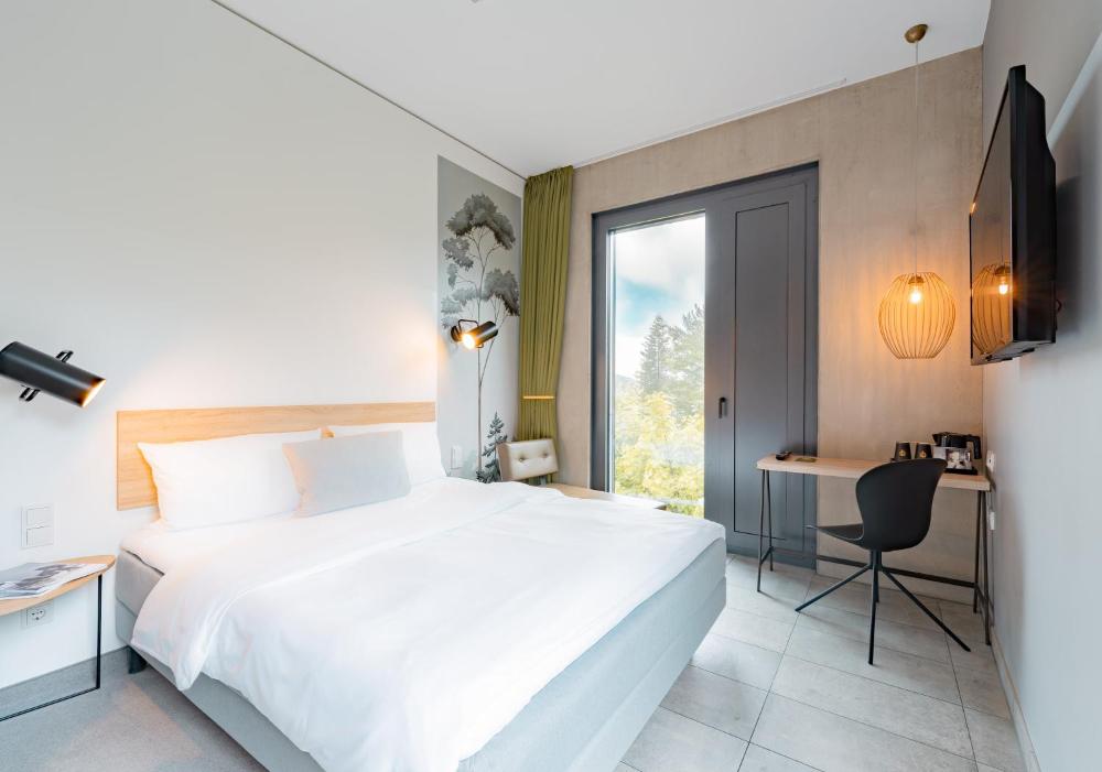 Die Zimmer mit raumhohen Fenstern sind mit einem Flachbild-Sat-TV, Tee- und Kaffeezubehör, einem Schreibtisch und einem Ankleidebereich ausgestattet. Das Bad verfügt über eine Dusche. In einigen Zimmern können Sie nach einem langen Tag in einem Sitzbereich entspannen.