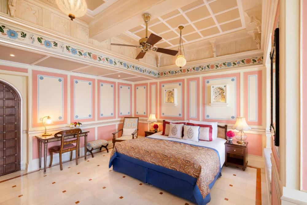 Das Taj Lake Palace liegt inmitten des Sees Pichola und verfügt über Marmorelemente und eine majestätische Architektur. Es bietet ein komplett ausgestattetes Spa und individuell gestaltete Programme wie z.B. ortsspezifische Yoga-Kurse. Die Zimmer verfügen über einen Butler-Service.