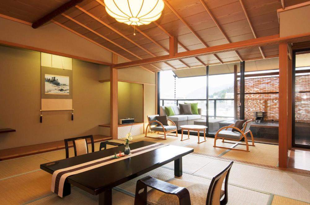 The spacious rooms feature a serene decor of sliding paper screens, tatami-mat flooring, and traditional futons. All rooms have a seating area, and some have an outdoor hot spring bath.