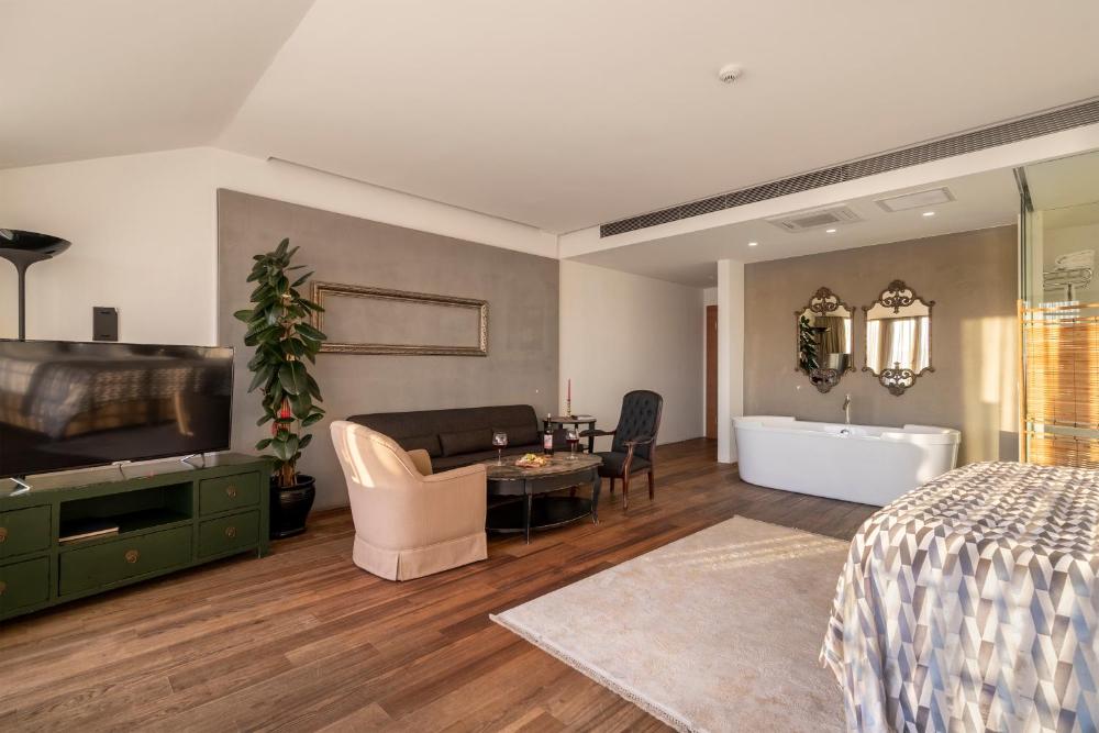 Breakfast is served to the room. The hotel's gourmet Eftalikus Pub & Restaurant serves Aegean cuisine in a warm and cozy atmosphere. The stylish, modern suites vary in size from 50 to 213 ft². All of them offer a living room and a dressing room.