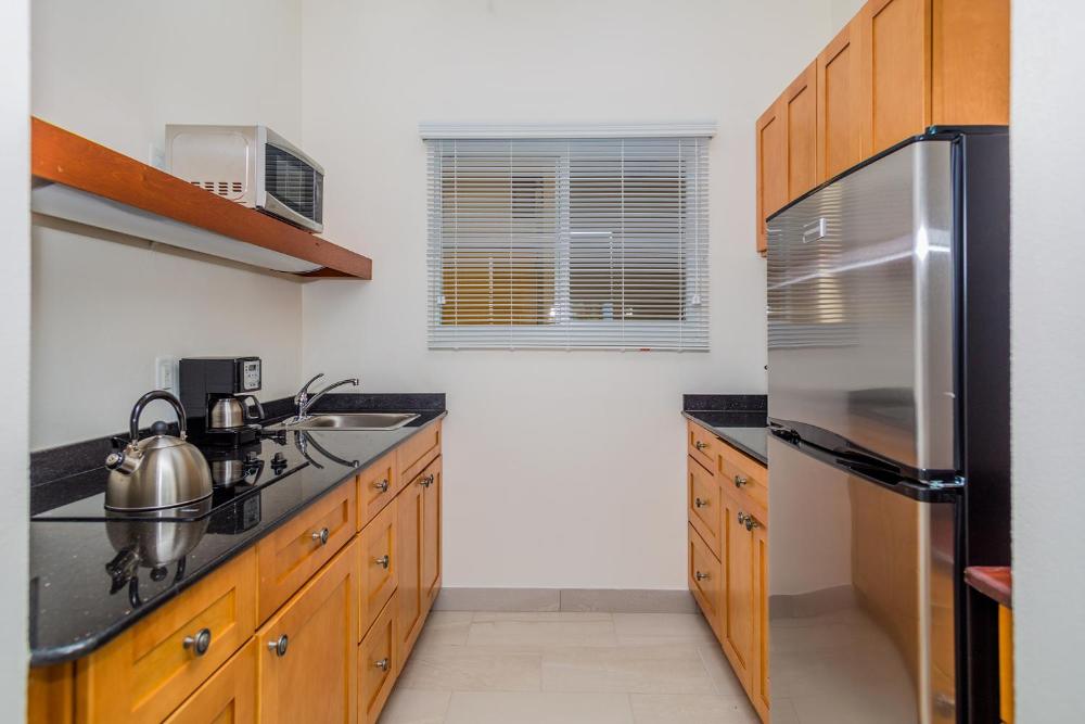 Selected rooms contain a kitchen with a fridge, an oven and a microwave.