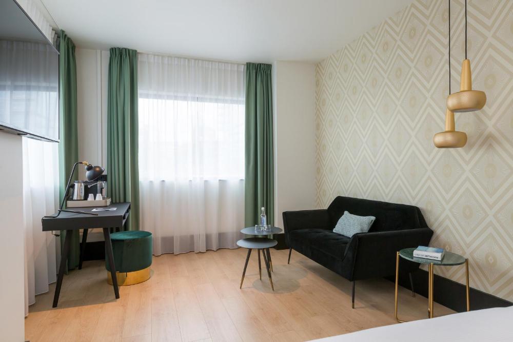All guest rooms in the hotel are equipped with a design bathroom with rain shower, safe, fridge, television, desk and quality king size beds. Some units at The James Rotterdam also boast a seating area and boast city views.