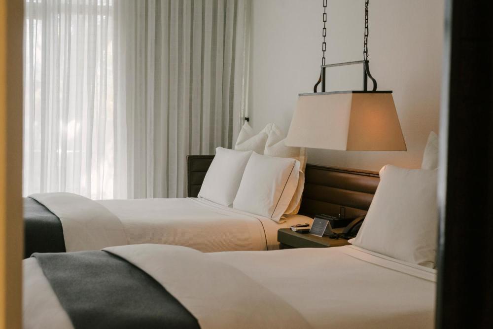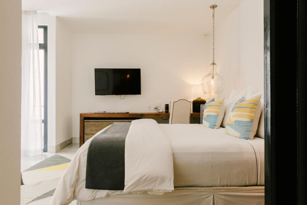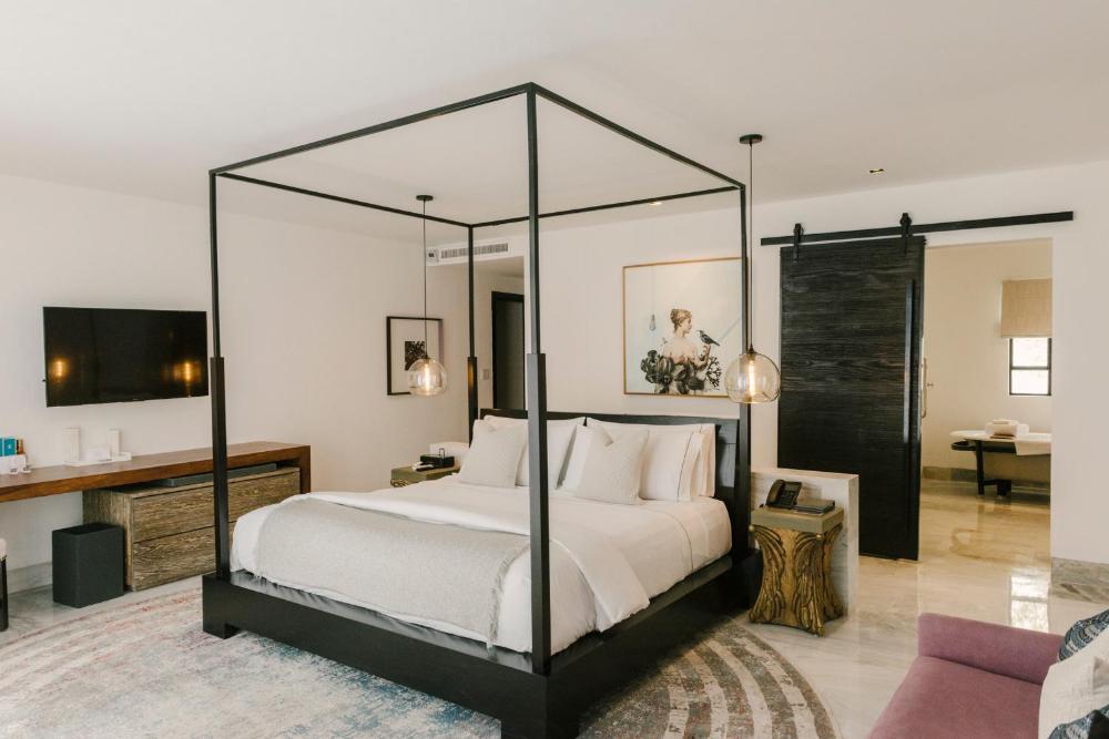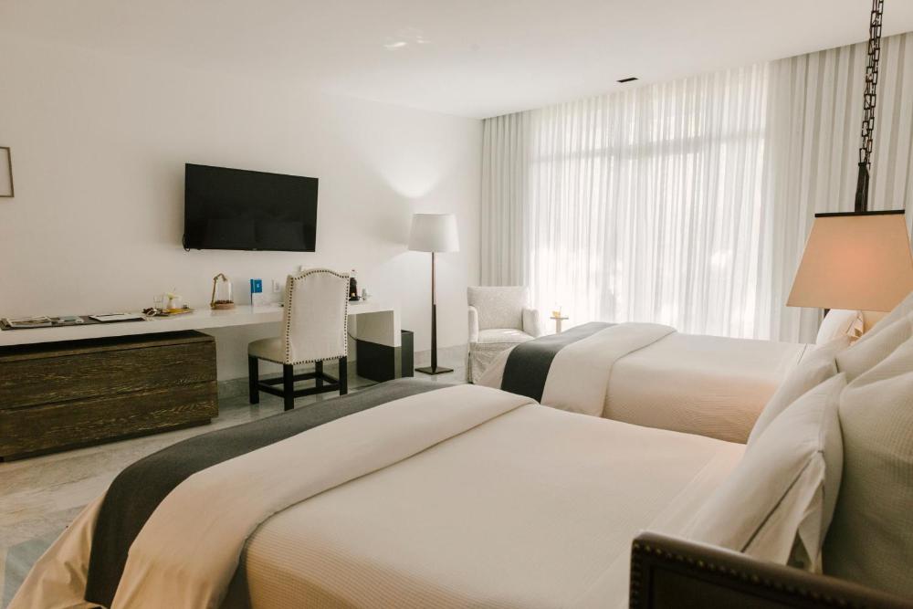 The rooms and suites are decorated with modern Mexican photography. The large bathrooms have double sinks.