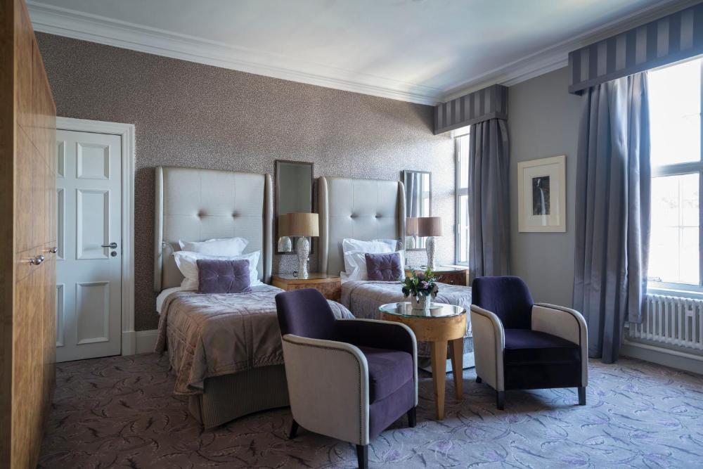 El The Gleneagles Hotel es un prestigioso complejo fundado en 1924 situado en el centro de Escocia, en un terreno de unas 344 hectáreas, y que ofrece 3 campos de golf de competición, spa ESPA, escuela de cetrería y la posibilidad de practicar la conducción todoterreno, la equitación, el entrenamiento de perros y el tiro.