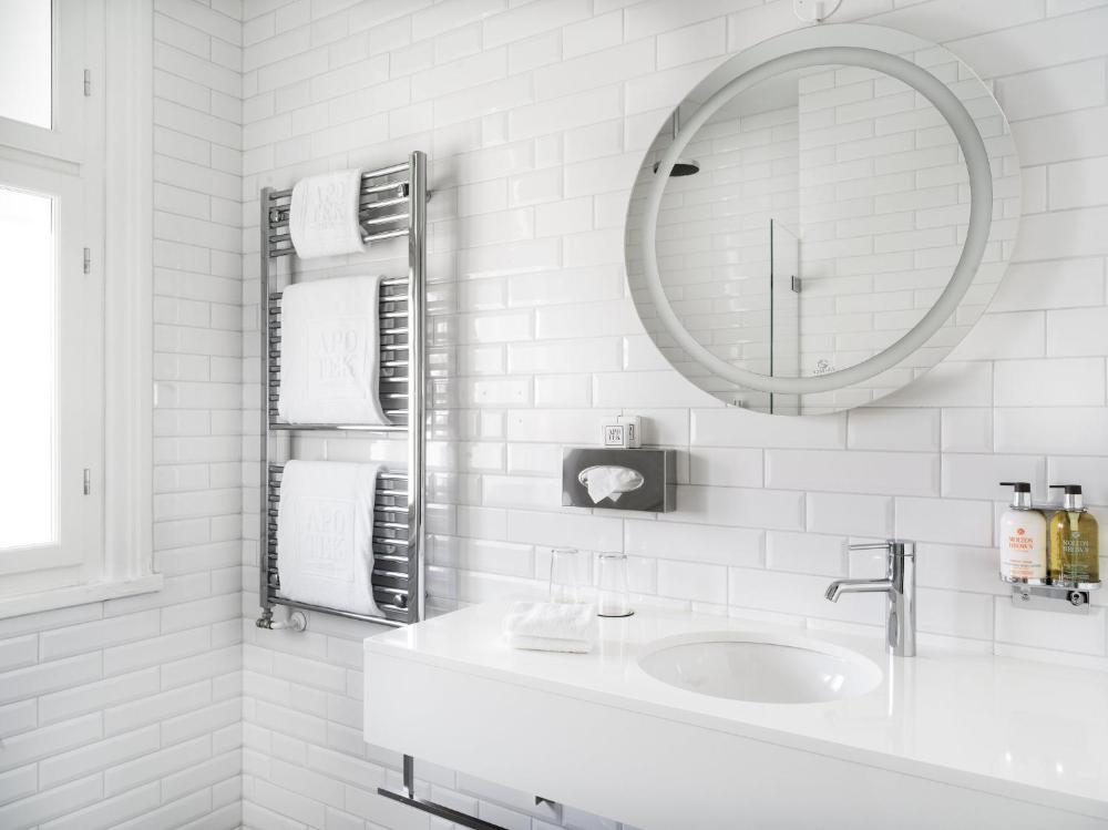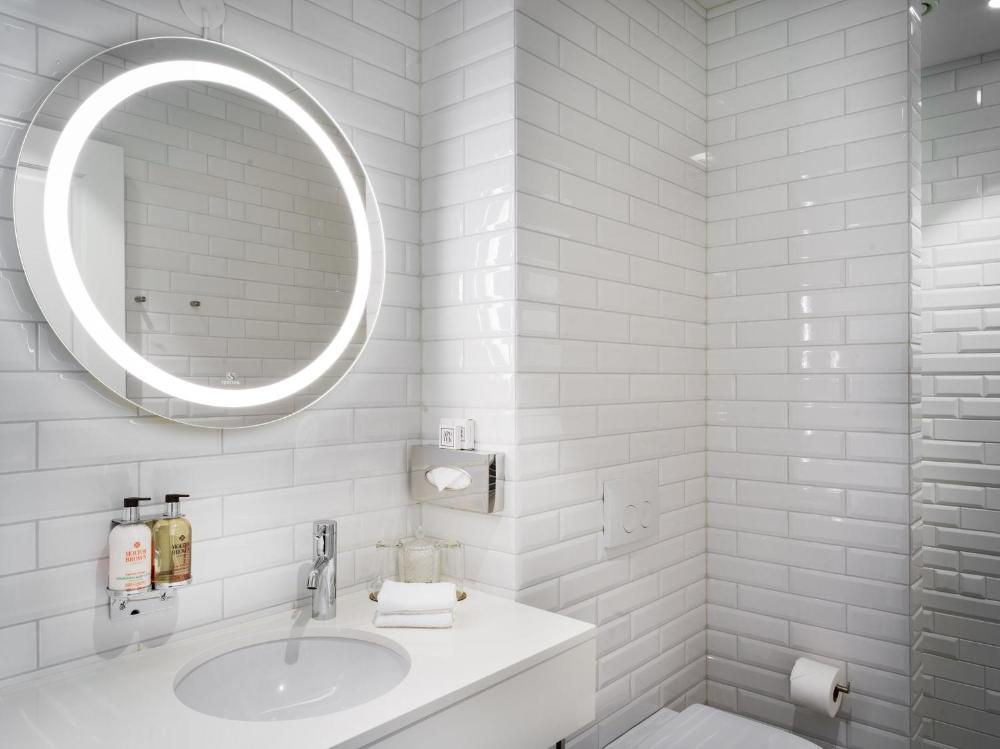 Todas las habitaciones del Apotek Hotel cuentan con zona de estar, minibar, escritorio y baño alicatado con ducha, secador de pelo y artículos de aseo gratuitos.
