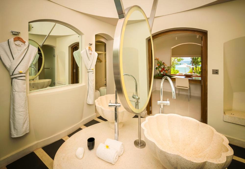 Conçues dans un style contemporain par l'architecte Lek Bunnag et décorées par Kenzo Takada, les chambres, les suites et les villas sont munies d'une baignoire en plein air ou d'une piscine. Elles comprennent également un jardin privé ainsi qu'une terrasse donnant sur une végétation luxuriante. Certaines chambres offrent une vue sur l'océan Indien. Un service de majordome est disponible 24h/24 dans les suites ou les villas.
