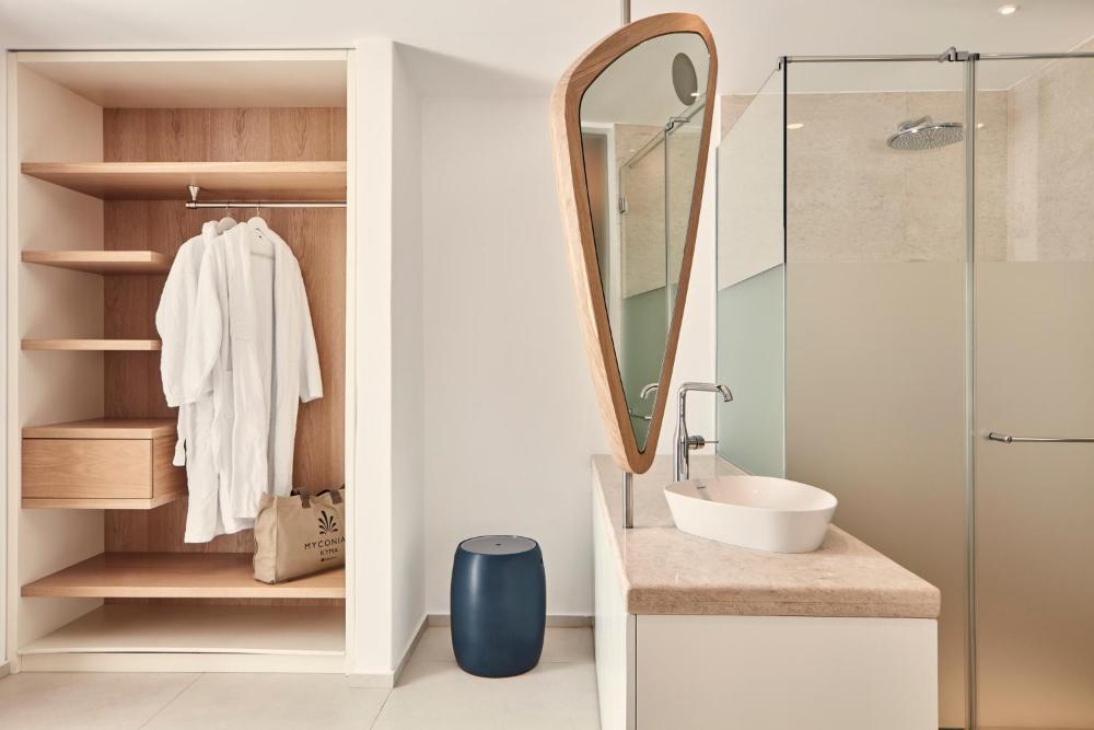 Les chambres et suites du Kyma suivent les lignes droites et les courbes de l'architecture cycladique. Certaines possèdent leur propre piscine privée offrant une vue sur la mer. Toutes disposent d'une télévision par satellite, d'un minibar, de chaussons et d'articles de toilette gratuits.