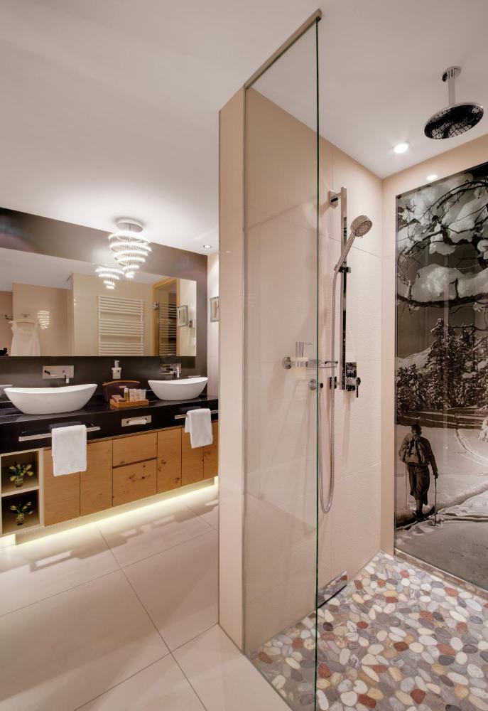 Le eleganti camere del Giardino presentano interni confortevoli arredati in romantico stile neo-alpino e sono dotate di balconi, bagni moderni e TV a schermo piatto.