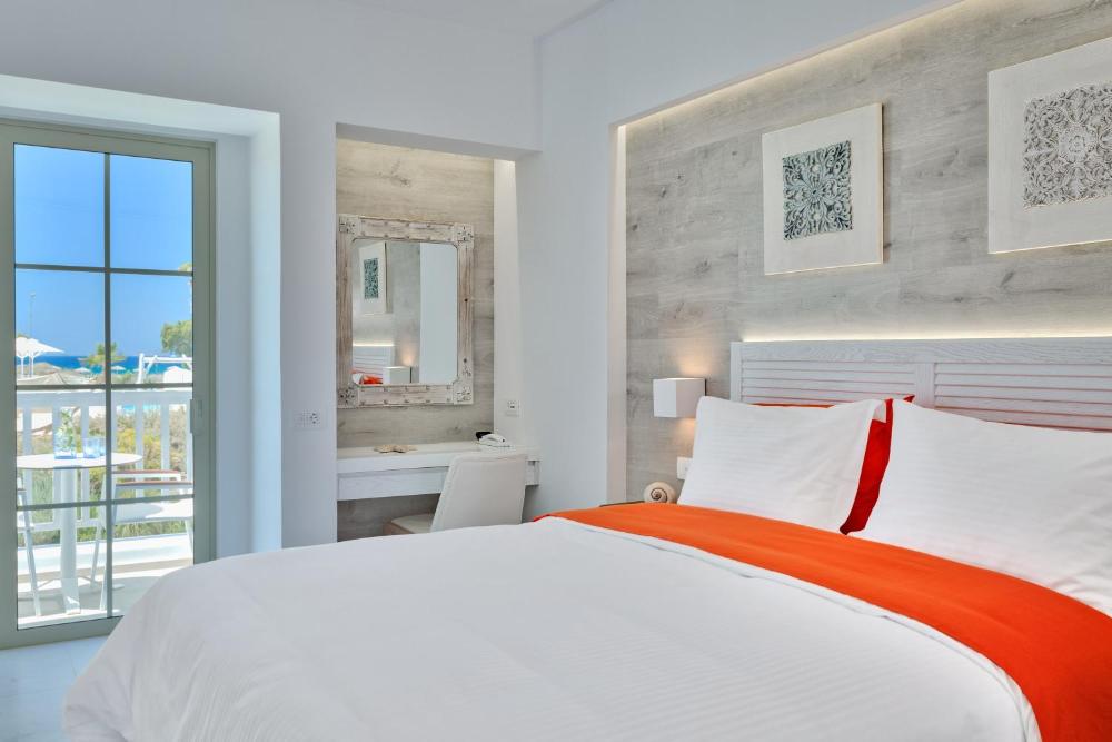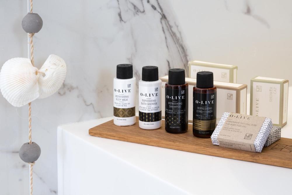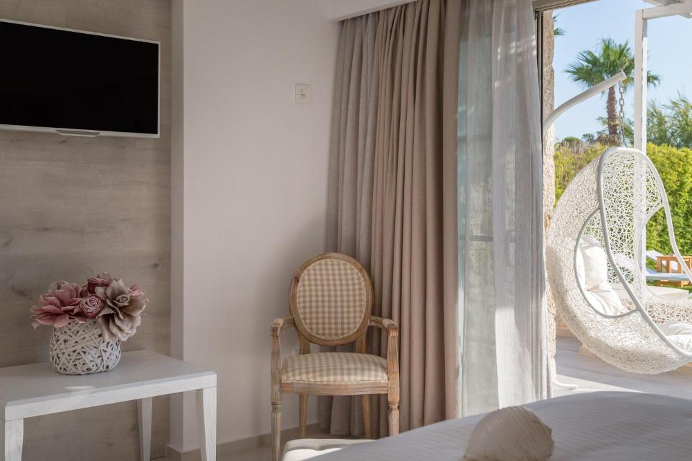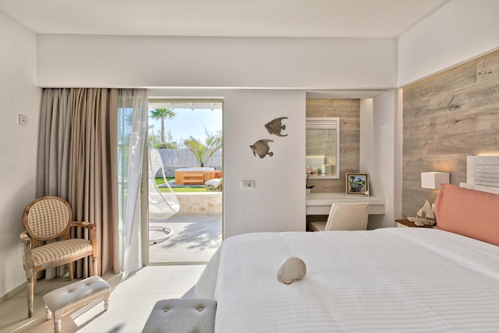 Caratterizzate da un design moderno, le suite sono munite di raffinata biancheria, opere d'arte accuratamente selezionate e soggiorno. Alcune vantano una vasca idromassaggio privata e/o un balcone o un patio e/o una magnifica vista sul Mar Egeo.