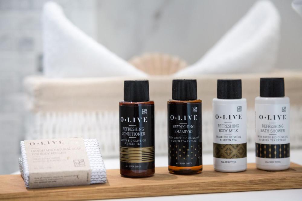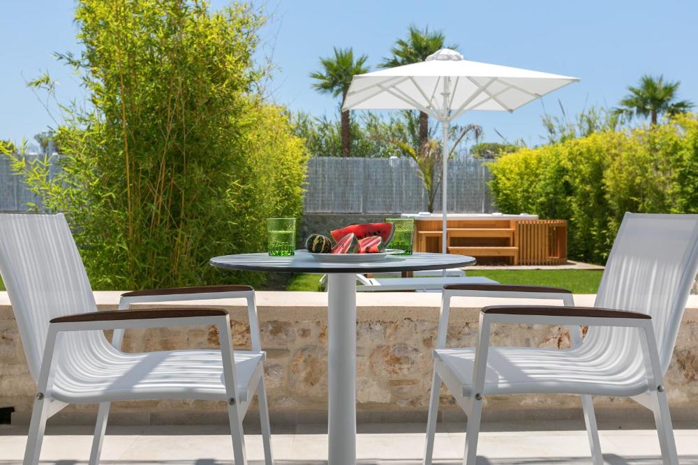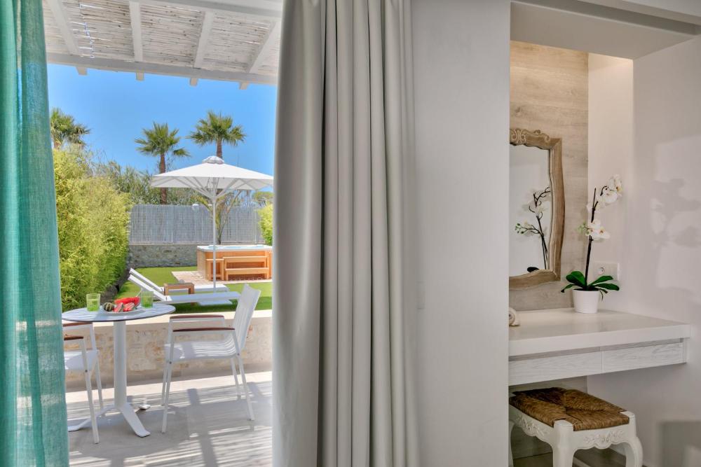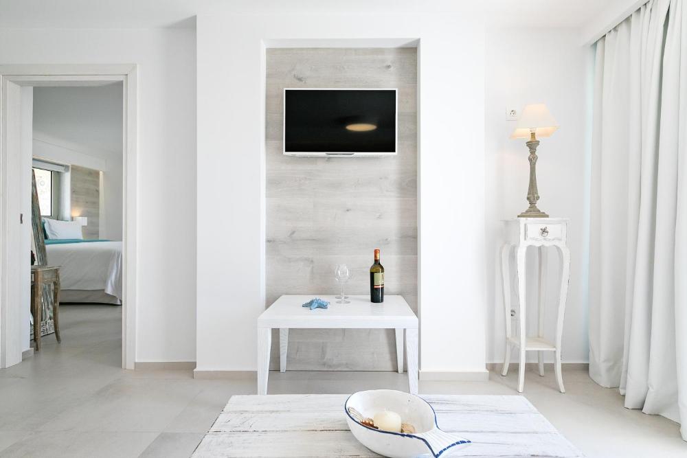 Caratterizzate da un design moderno, le suite sono munite di raffinata biancheria, opere d'arte accuratamente selezionate e soggiorno. Alcune vantano una vasca idromassaggio privata e/o un balcone o un patio e/o una magnifica vista sul Mar Egeo.