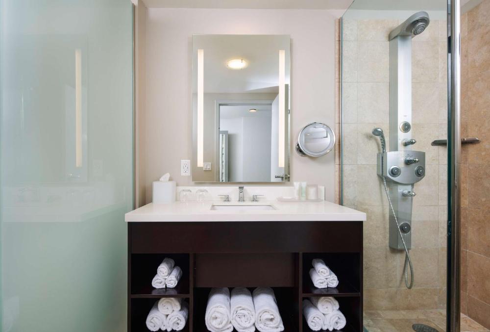 Each guestroom at the The Lofton Hotel is equipped with a wall mounted flat-screen TV and a fully stocked minibar. Guests can stay connected with beside electrical outlets and reading lamps. Bathrooms have limestone counters and stylish glass basins.