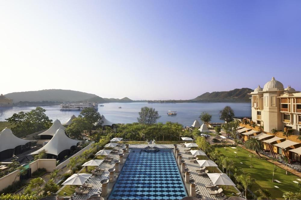 Immerso in un parco paesaggistico, il lussuoso The Leela Palace Udaipur vi attende con una piscina all'aperto e una spa esclusive e con camere dotate di vista mozzafiato sul City Palace o sul lago Pichola.